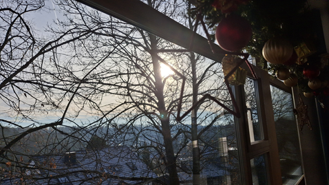 Das Foto zeigt, wie die winterliche Morgensonne durch die Adventsdeko im Roncalli blinzelt. Die Leute vom sonnenAufgang können berichten, dass unser Fixstern Sonne jetzt gerade Richtung Unterdorf am Horizont auftaucht.