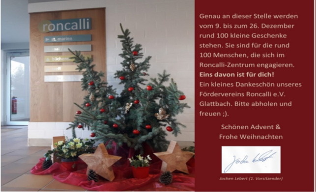 Zusätzlich gibt es da aber auch noch die aktuell 109 Mitglieder unseres Fördervereins Roncalli e.V. Glattbach. Die liefern Jahr für Jahr einen beachtenswerten finanziellen Beitrag zum Unterhalt des Roncalli-Zentrums. Zuletzt durch das Sponsoring der Regenwasserzisternen. Nicht wenige unter ihnen liefern sogar beides: Engagement & Beitrag. Respekt!