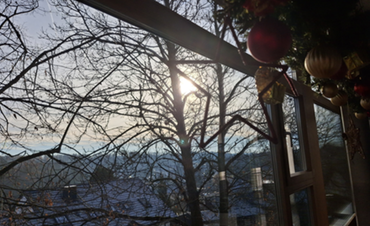 Das Foto zeigt, wie die winterliche Morgensonne durch die Adventsdeko im Roncalli blinzelt. Die Leute vom sonnenAufgang können berichten, dass unser Fixstern Sonne jetzt gerade Richtung Unterdorf am Horizont auftaucht ...